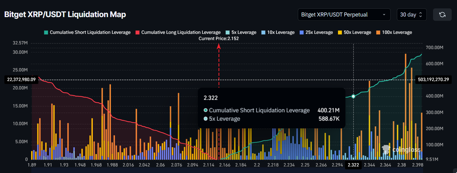 Likvidointikartta osoittaa, että merkittävä määrä lyhyitä positioita—noin 400 miljoonan dollarin arvosta—on likvidoinnin vaarassa, jos XRP:n hinta nousee 2,32 dollariin. Vaikka XRP:n kaupankäyntihinta on 2,15 dollaria, vain 8 % kynnysarvosta 2,32 dollaria, likvidointien mahdollisuus ei vaikuta välittömältä.