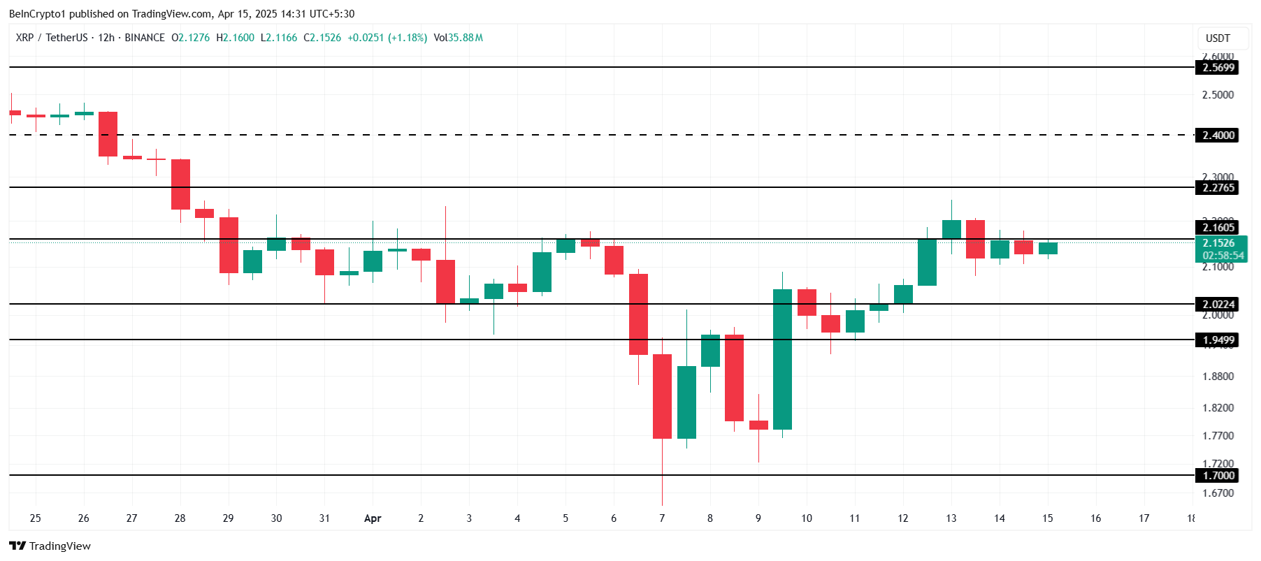 XRP on tällä hetkellä kaupankäynnissä 2,15 dollarilla, juuri alle 2,16 dollarin paikallisen vastustason, jota se ei onnistunut varmistamaan tukena aiemmin tässä kuussa. Altcoin konsolidoituu alle 2,27 dollarin, vastustason, joka on ollut kiistakapula maaliskuun lopusta lähtien. Jos hinta pysyy yli 2,00 dollarin tukitason, se voi vakautua näillä tasoilla, estäen lisätappioita sijoittajille.