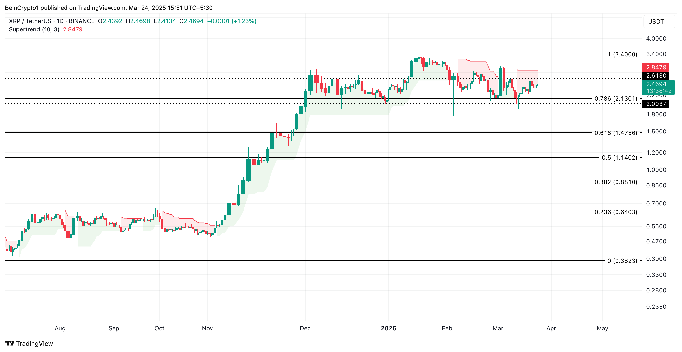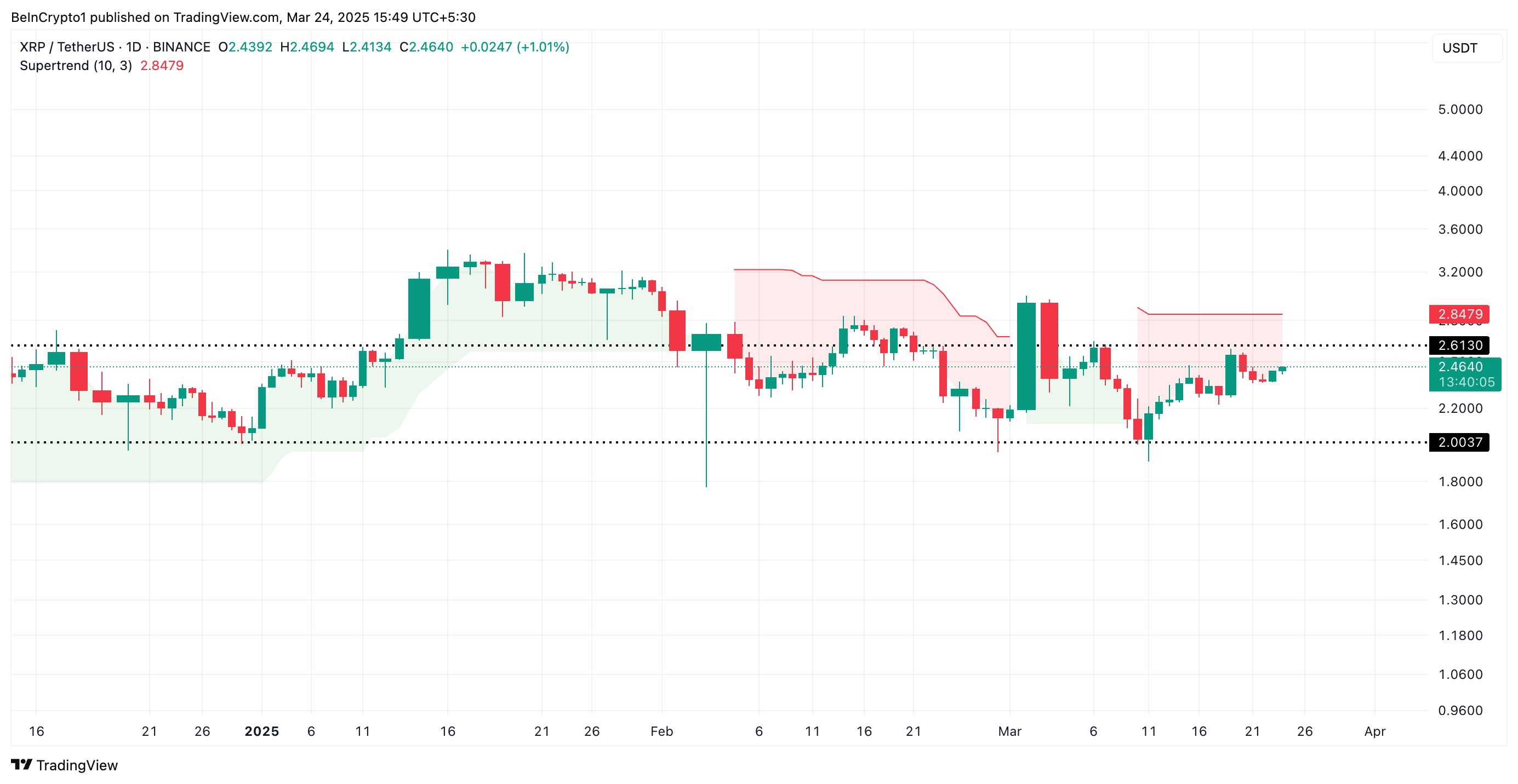 Toisaalta, jos ostotoiminta saa suuntausta, altcoin voi yrittää murtautua vastuksen yläpuolelle 2,61 dollarissa. Jos murtautuminen onnistuu, XRP voi nousta kohti Super Trend indikaattoria 2,84 dollarissa.