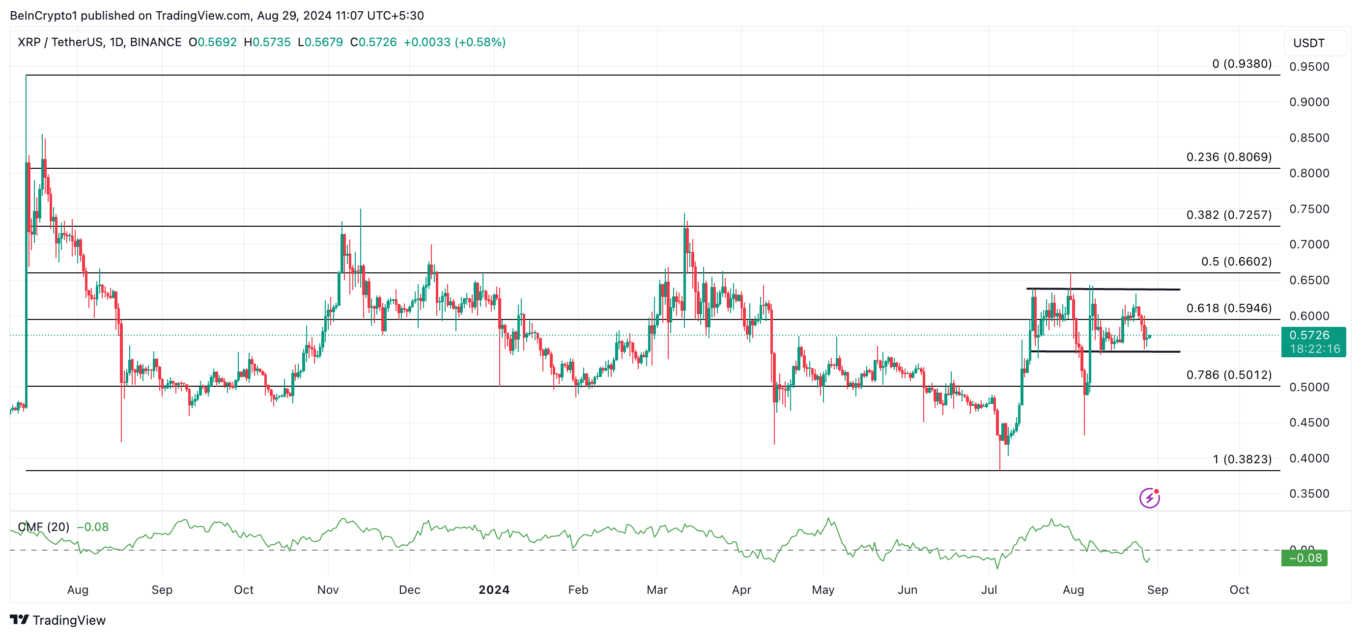 Tällä hetkellä XRP käy kauppaa 0,57 dollarilla ja on liikkunut vaakasuorassa kanavassa 17. heinäkuuta lähtien. Kun omaisuuserän hinta vaihtelee tietyn haarukan sisällä, se luo kanavan, joka heijastaa ostamisen ja myymisen paineiden tasapainoa, estäen hinnan voimakkaan liikkeen kumpaankaan suuntaan.
