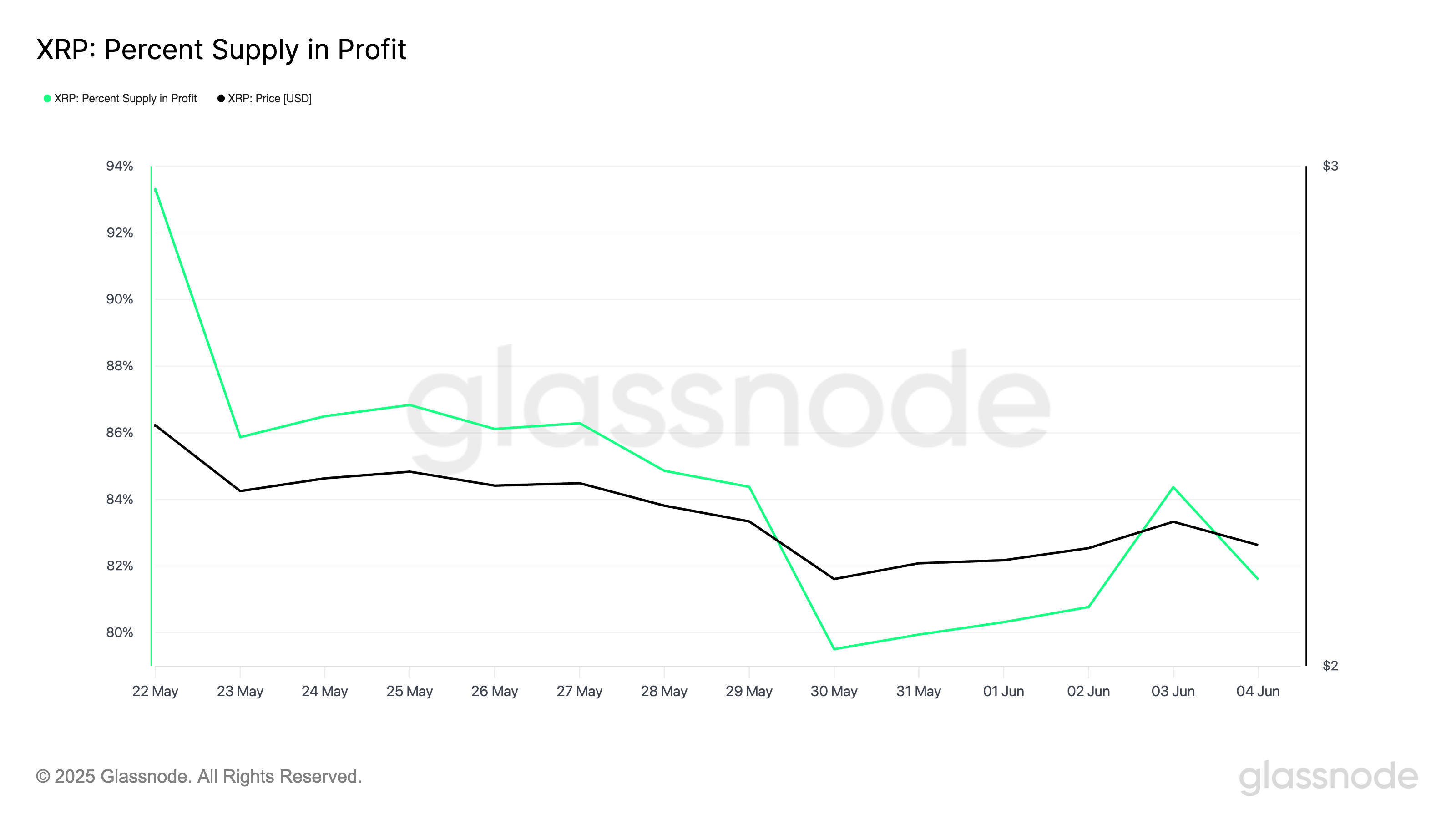 Glassnoden mukaan, laskettuaan monen kuukauden alimmalle tasolle 79 %:iin 31. toukokuuta, tunnusluku on noussut, ja nyt 82 % XRP:n haltijoista on kirjoitushetkellä realisoimattomissa voitoissa.