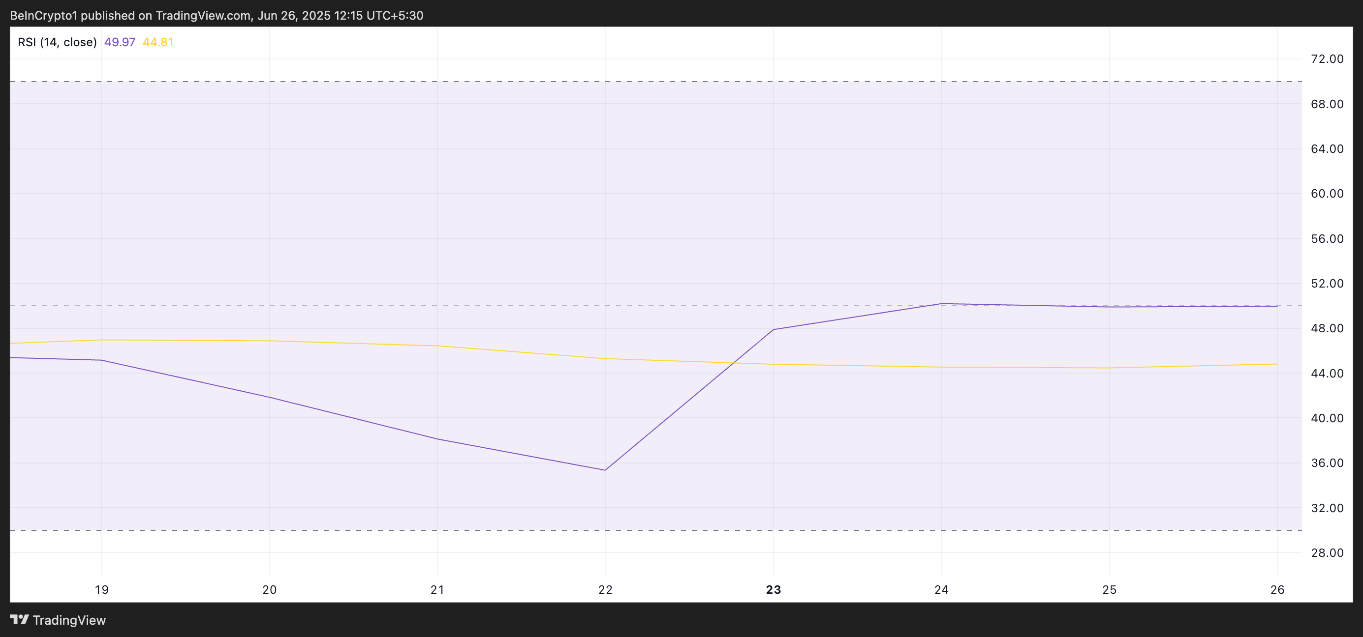 Tärkeät tekniset indikaattorit vahvistavat tämän pattitilanteen. Esimerkiksi XRP:n suhteellinen voimaindeksi (RSI) on tasaantunut tiistaista lähtien, mikä osoittaa suhteellista tasapainoa osto- ja myyntipaineiden välillä. Kirjoitushetkellä RSI on 49,97, pysyen neutraalin 50 pisteen tuntumassa tiistaista lähtien.
