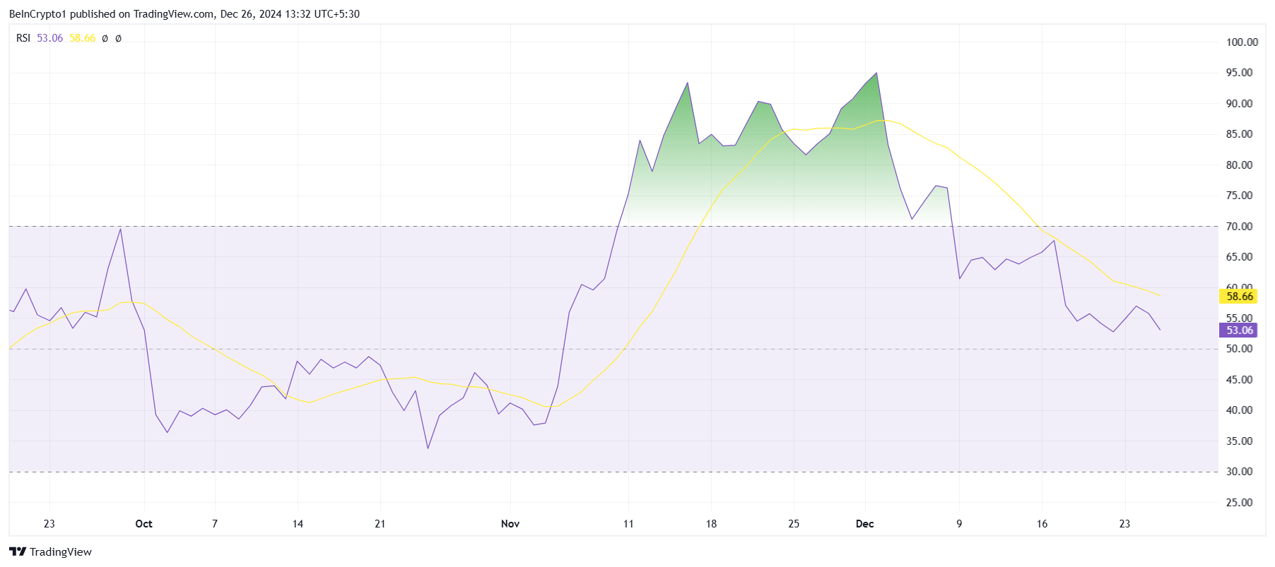 XRP:n makromomentum osoittaa myös karhumaisia taipumuksia, kun suhteellinen voimaindeksi (RSI) liukuu alaspäin. Tämä lasku osoittaa, että karhumomentum vahvistuu, mikä lisää XRP:n haasteita. RSI pysyy kuitenkin neutraalin rajan yläpuolella, mikä viittaa siihen, että myyntipaine ei ole vielä ylivoimainen.