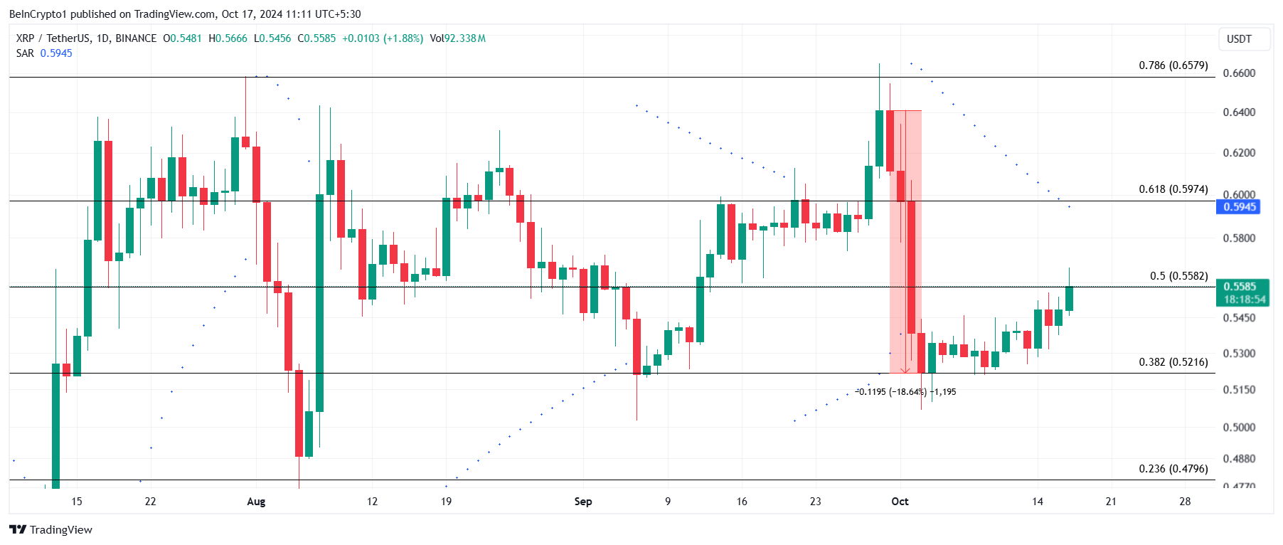 XRP:n hinta on toipunut tasaisesti syyskuun lopun tappioistaan, jotka näkivät 18 %:n laskun hinnassa. Tällä hetkellä kaupankäyntihinta on 0,55 dollaria, ja altcoin on lähellä vanhan tukitason takaisinvaltaamista, mikä viittaa mahdollisen uuden hintarallin alkamiseen.