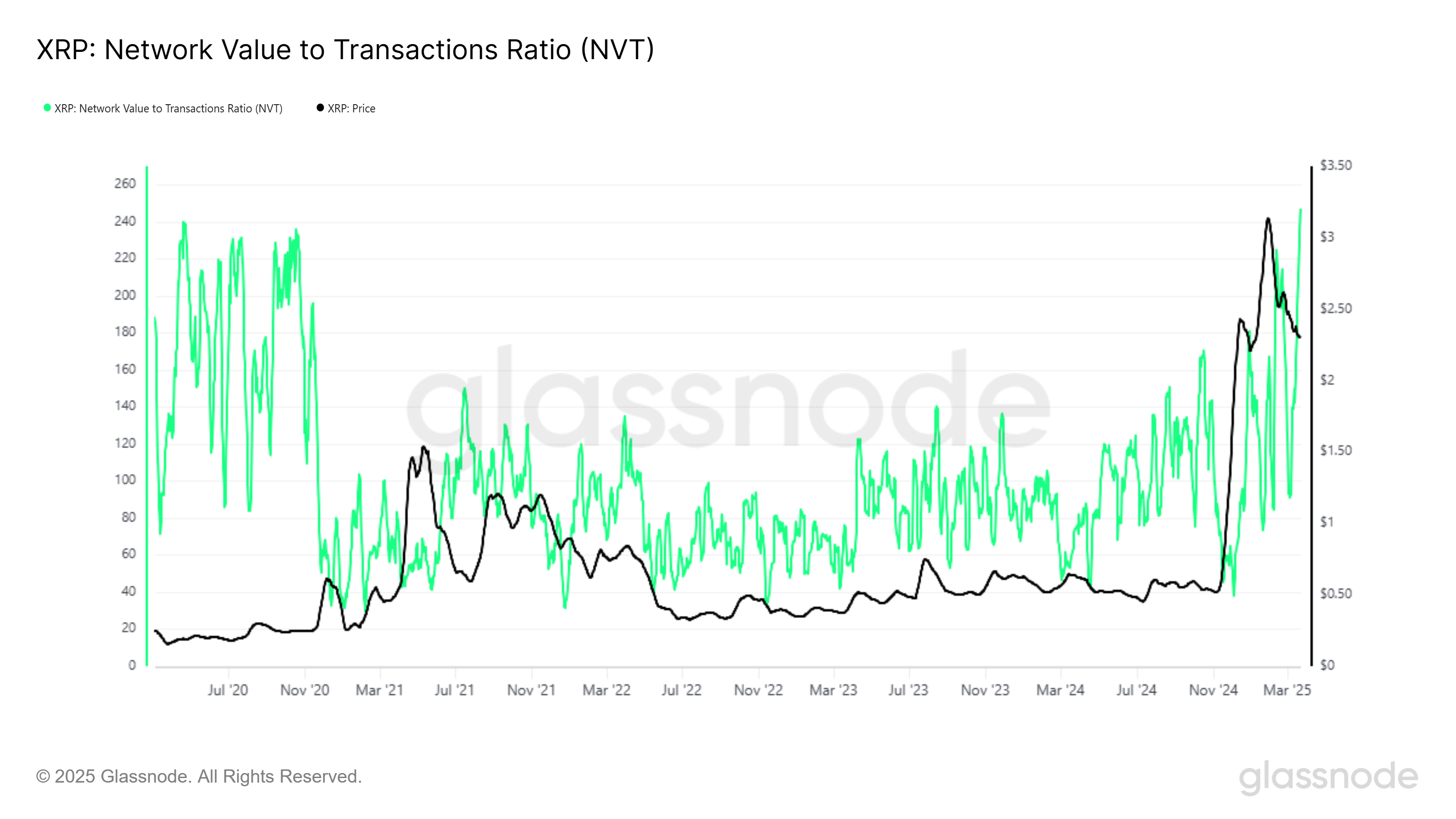 Network Value to Transaction (NVT) -suhde XRP:lle on saavuttanut viiden vuoden huipun, taso, jota ei ole nähty tammikuusta 2020 lähtien. Tämä tunnusluku vertaa kryptovaluutan markkina-arvoa sen verkossa suoritettujen transaktioiden määrään.