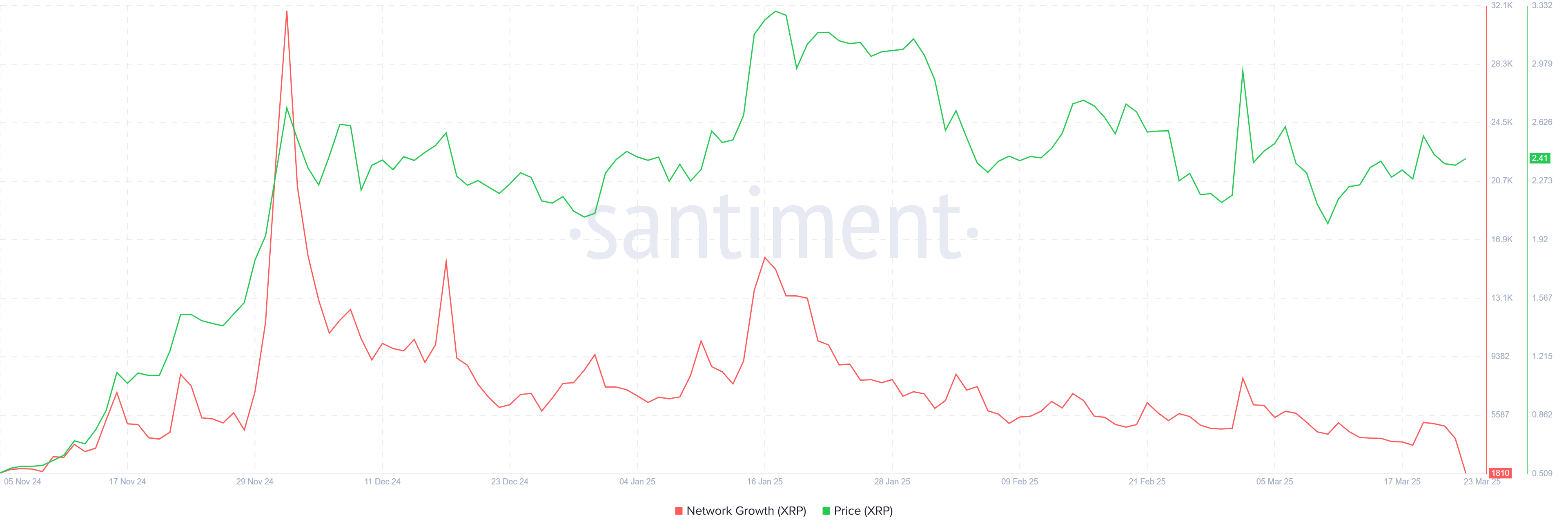 XRP:n makrotunnelma osoittaa myös merkkejä rasituksesta. Verkoston kasvu on tällä hetkellä neljän kuukauden alhaisimmalla tasolla, mikä heijastaa uusien osoitteiden luomisen hidastumista.