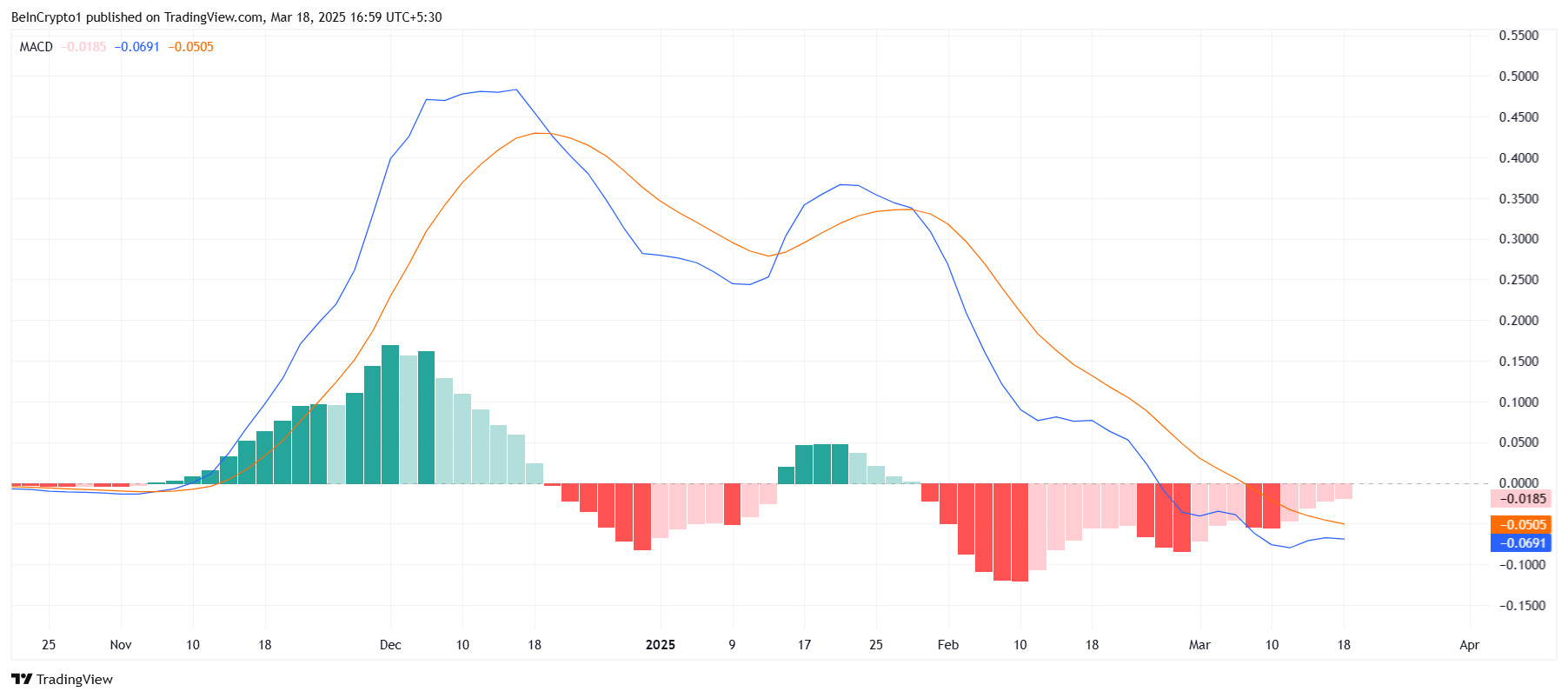 Laajemmat markkinaolosuhteet vaikuttavat myös XRP:n hintavaikeuksiin. Tekniset indikaattorit, kuten MACD (Moving Average Convergence Divergence), viittaavat siihen, että kryptovaluutta kohtaa edelleen karhumaista suuntausta.