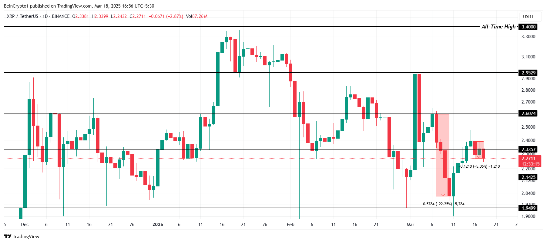 XRP käy tällä hetkellä kauppaa hintaan 2,27 dollaria, laskien 5 % viimeisten kolmen päivän aikana. Altcoin ei ole onnistunut pitämään tukeaan 2,33 dollarissa ja lähestyy nyt seuraavaa kriittistä tukitasoa 2,14 dollaria. Jos nykyinen suuntaus jatkuu, XRP todennäköisesti testaa tätä alempaa tukea tulevina päivinä, pyyhkien pois osan viimeaikaisista voitoista ja aiheuttaen lisäviivästyksiä mahdollisessa palautumisessa.