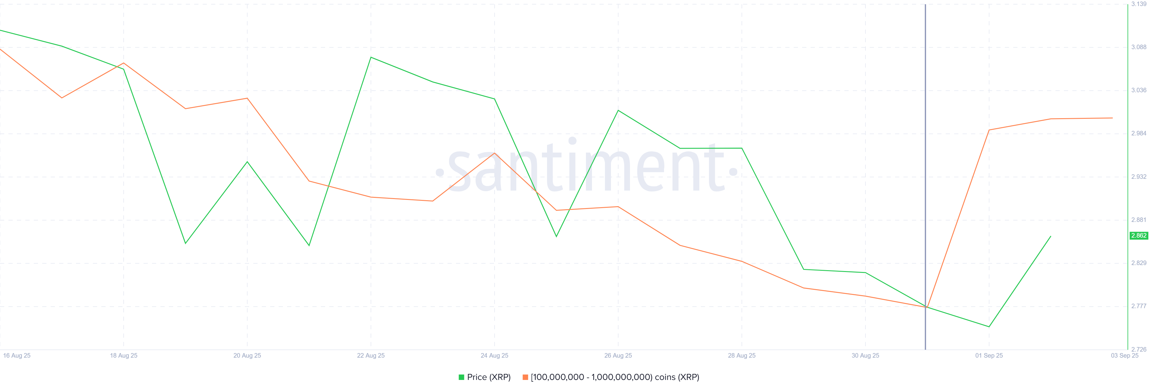Lähes kolmen viikon vähentyneen toiminnan jälkeen XRP-valaat keräävät jälleen. Tiedot osoittavat, että osoitteet, jotka pitävät hallussaan 100 miljoonan ja 1 miljardin XRP:n välillä, ovat ostaneet yli 400 miljoonaa tokenia viimeisten kolmen päivän aikana. Nykyisillä hinnoilla tämä kerääminen edustaa yli 1,1 miljardin dollarin sijoitusta.