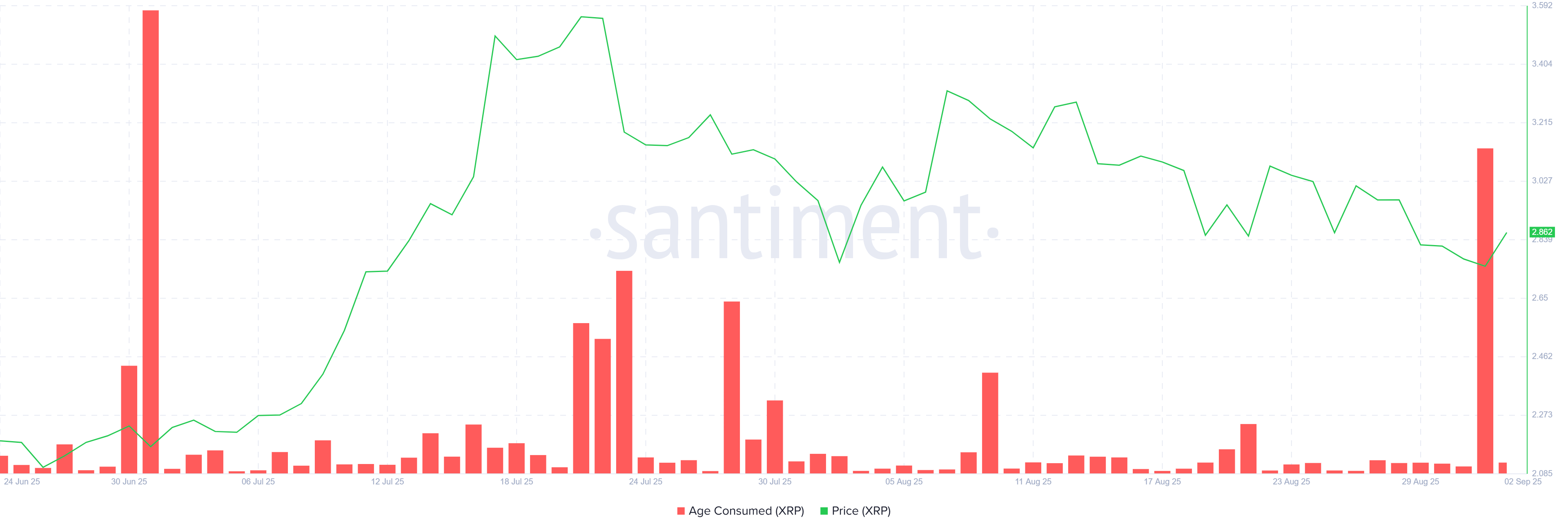 Samaan aikaan pitkäaikaiset haltijat ovat osoittaneet eri asennetta. Ikäkulutustunnusluku, joka seuraa lepotilassa olevien tokenien liikettä, on noussut jyrkästi. Tämä viittaa siihen, että pitkään pidettyä XRP:tä myydään markkinoille. Nykyinen nousu on suurin yli kahteen kuukauteen, mikä osoittaa merkittävää jakelua.