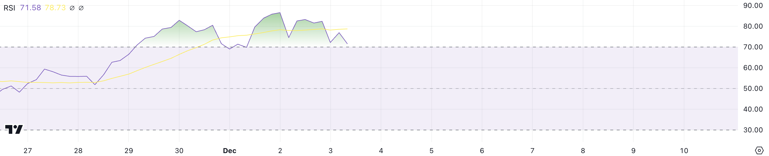 XRP:n Relative Strength Index (RSI) on pysynyt yliostetussa tilassa yli 70:ssä marraskuun lopusta lähtien, saavuttaen huippuja lähellä 90:tä ennen kuin se laski äskettäin 71,5:een. Tämä pitkäaikainen yliostettu tila on linjassa Ripple merkittävän hinnannousun kanssa, mikä osoittaa vahvaa nousujohteista momenttia, joka on hallinnut markkinoita useiden viikkojen ajan.