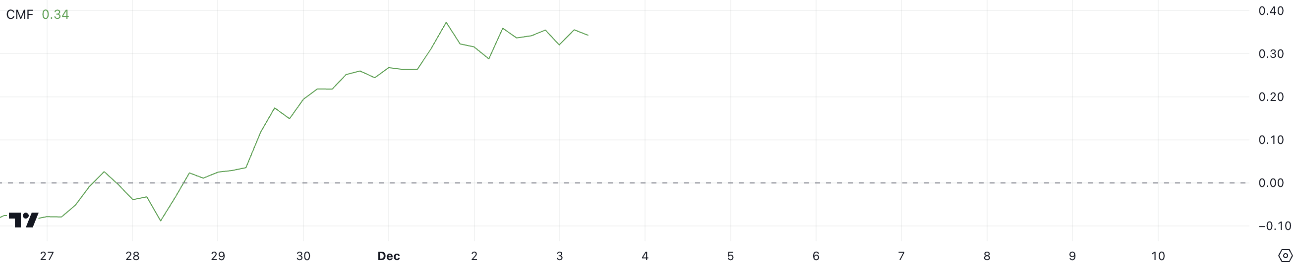 Chaikin Money Flow (CMF) Ripple hinnalle on säilyttänyt vahvan positiivisen arvon 0,34, jatkaen nousujohteista momenttiaan marraskuun 29. päivästä lähtien.