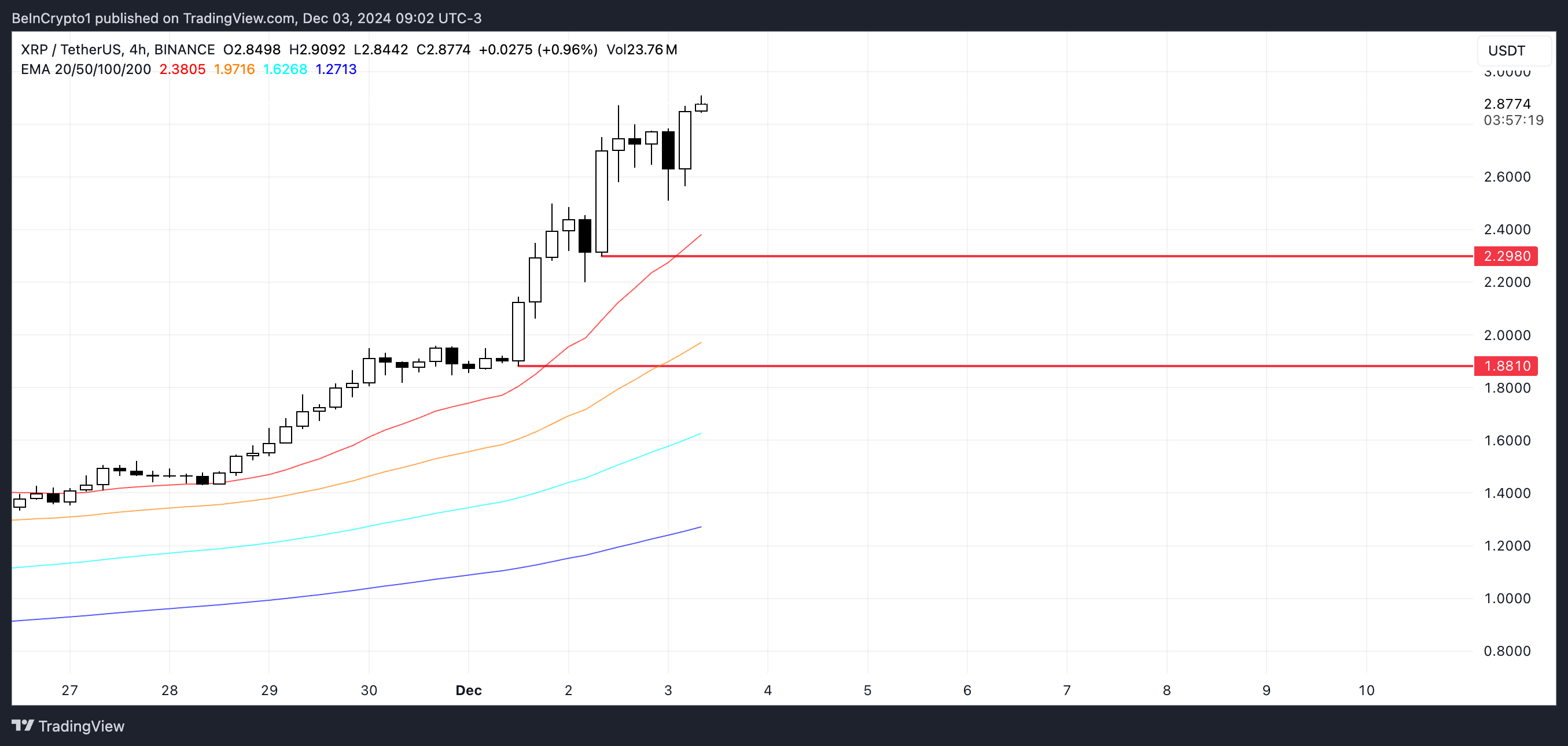 XRP EMA-linjat osoittavat vahvaa nousujohteista rakennetta, nopeampien EMA:iden ollessa hitaampien yläpuolella ja hinnan liikkuessa mukavasti lyhimmän EMA:n yläpuolella. Härkämarkkinoiden jatkuessa XRP kohtaa merkittävän psykologisen ja historiallisen tavoitteen 3,00 dollarissa.