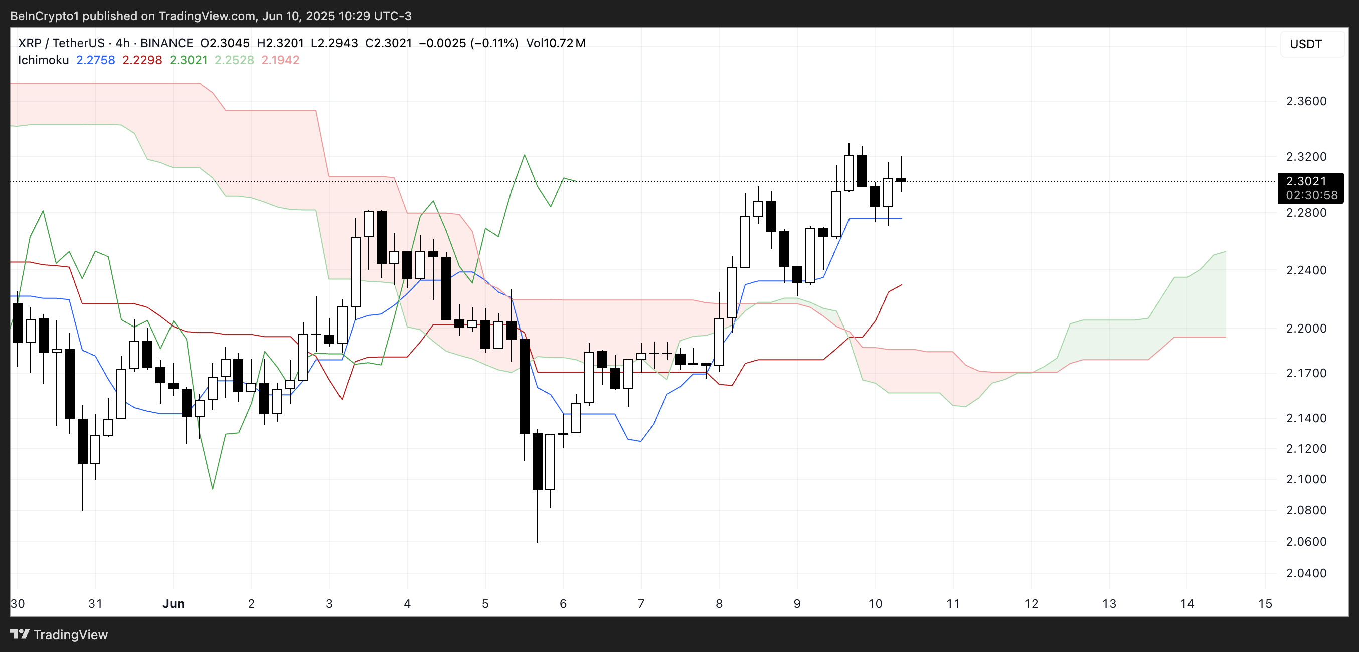 XRP:n Ichimoku Cloud -kaavio esittää nousujohteisen kuvan. Hintakynttilät ovat punaisen ja sinisen viivan yläpuolella, mikä osoittaa yleisesti nousevaa trendiä.
