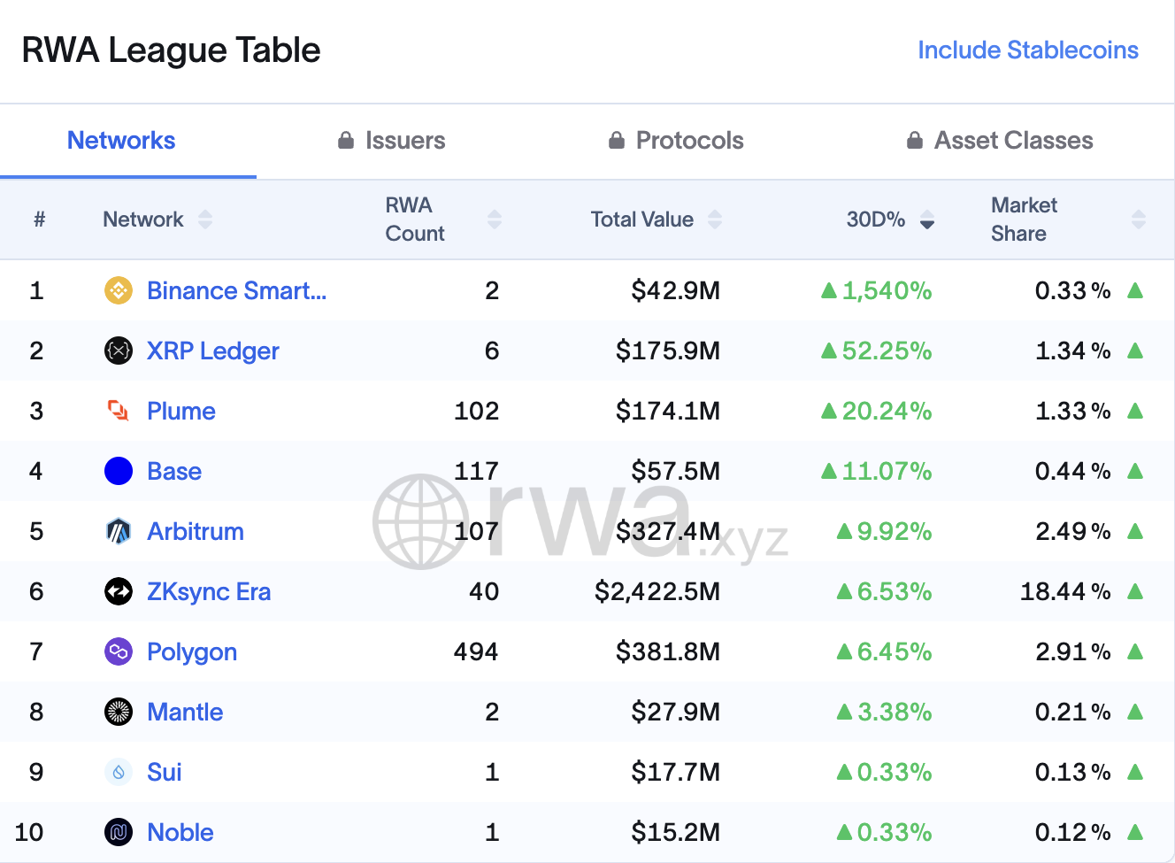 RWA.xyz:n tietojen mukaan viimeisten 30 päivän aikana RWA-arvo BNB Chainissa on noussut 1 540 %, mikä tekee siitä suurimman nousijan. Verkoston perässä oli XRPL, joka on kasvanut 52,2 %.