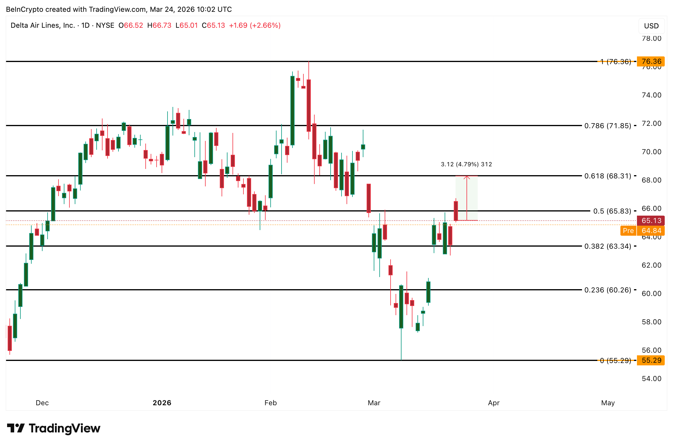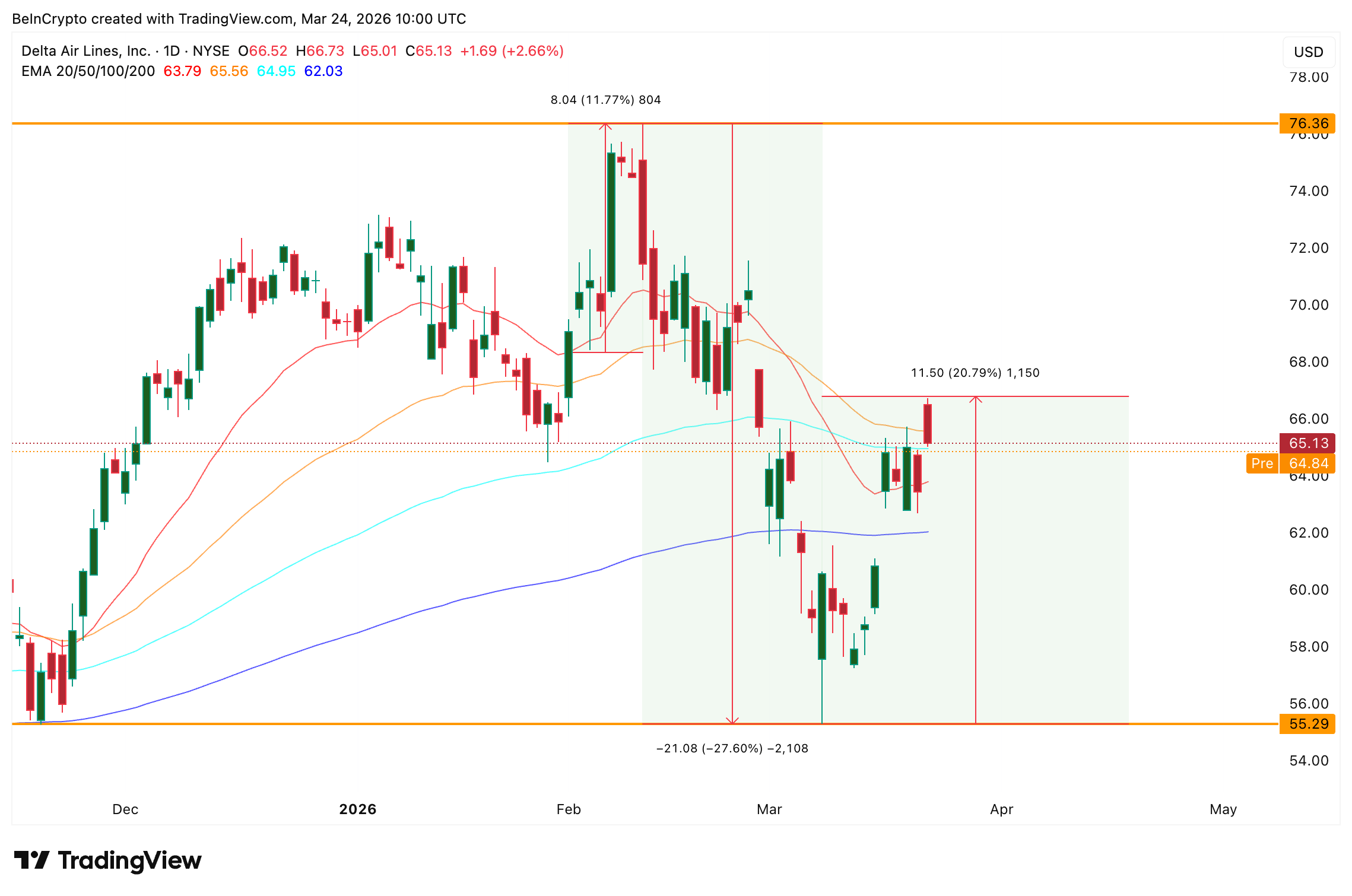 Fibonaccin palautus 76 dollarin huipusta 55 dollarin pohjaan asettaa 0,5-tason 65 dollariin, jota DAL parhaillaan testaa. Osake menetti 65 dollarin alueen viimeisimmässä istunnossa vahvoista päivänsisäisistä nousuista huolimatta, joten kyseinen taso on lähin palautettava vastus. Yli 65 dollarin 0,618 Fibonacci -taso, 68 dollaria, on seuraava merkittävä haaste.