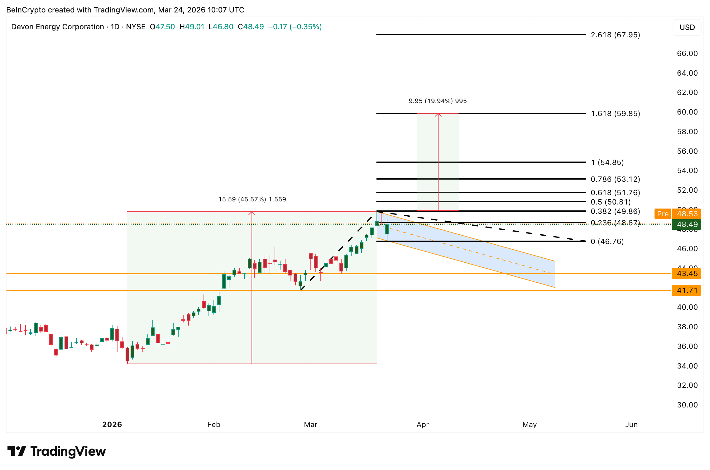 Päiväkaavio näyttää, että DVN konsolidoituu mahdollisessa lippukuvioksi kutsutussa rakenteessa 45 %:n nousun jälkeen, kuten ExxonMobilin jo murtama härkälippu. Merkittävin tukitaso on 46 dollaria. Jos taso pitää ja ylempi trendiviiva murtuu noin 49 dollarissa, mitattu hintaliike tähtää noin 59 dollariin, eli mahdollisesta murtuma-alueesta nähdään noin 20 %:n hintaralli.