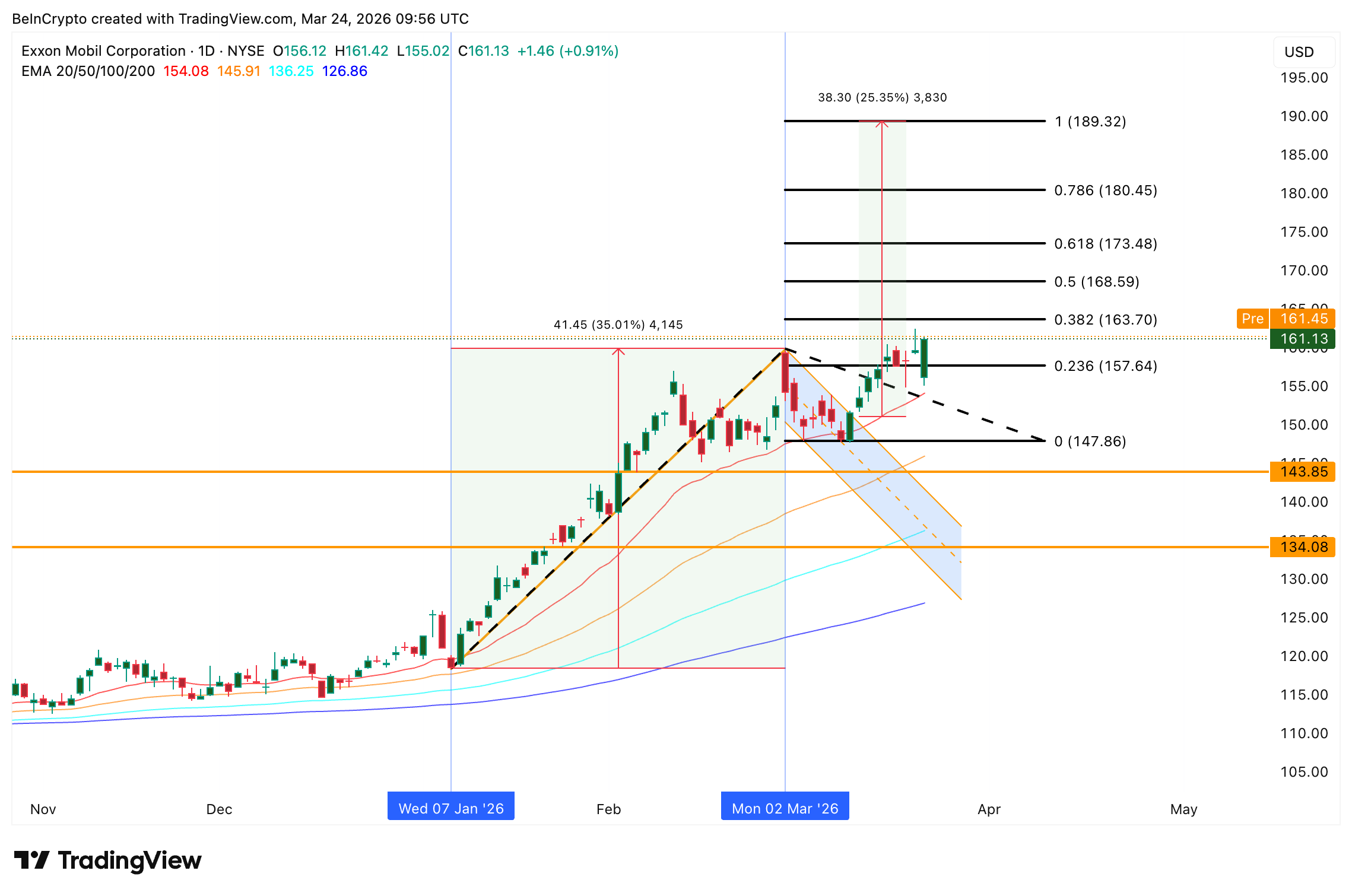 Tämän jälkeen XOM on noussut tasaisesti ensimmäiseen vastustasoonsa lähelle 163 dollaria. Jos tuo taso murtuu, seuraava 0,618 Fibonacci-tavoite on 173 dollaria, jota seuraavat 180 ja 189 dollaria. Osake käy tällä hetkellä yli neljän tärkeimmän eksponentiaalisen liukuvan keskiarvon (EMA): 20, 50, 100 ja 200 päivän. Nämä osoittavat trendisuuntaa tasoittamalla hinnanvaihteluita.