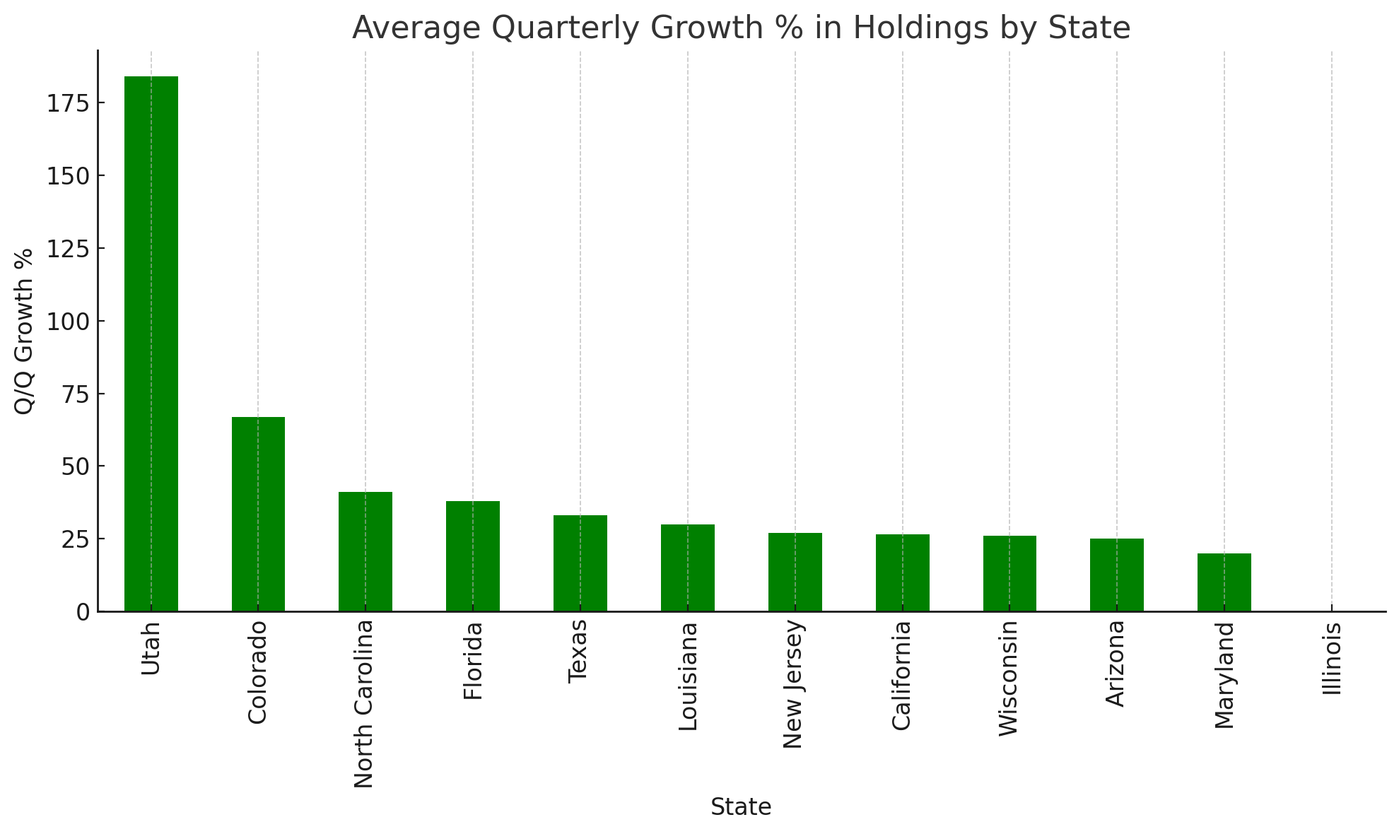 Erityisesti Utahilla, jolla on vaatimattomammat 25 287 osaketta, joiden arvo on 10 miljoonaa dollaria, on korkein neljännesvuosittainen kasvuvauhti, 184 %, mikä osoittaa nopeaa viimeaikaista kertymistä.