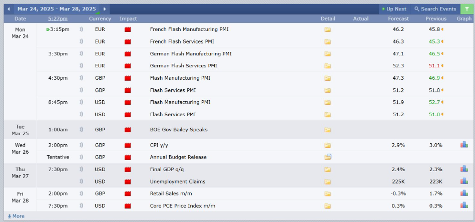 S&P Globalin Yhdysvaltain palvelu- ja teollisuustuotannon PMI-data, joka julkaistaan maanantaina 24. maaliskuuta, arvioi näiden kriittisten alojen terveyttä. Viimeaikaiset suuntaukset osoittavat teollisuustuotannon olevan vahva 52,7, kun taas palvelut seuraavat 51,0.