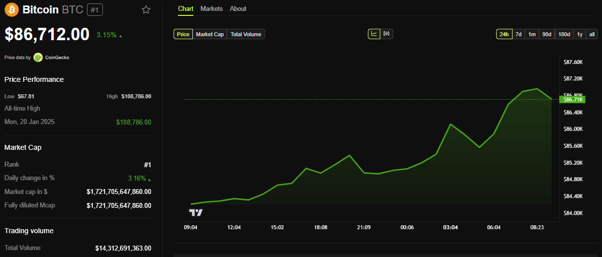 BeInCrypto tietojen mukaan BTC:n hinta oli 86 712 dollaria, nousua yli 3 % viimeisen 24 tunnin aikana.