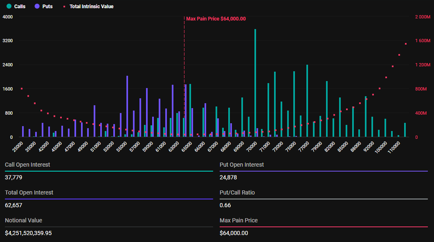 Deribitin tietojen mukaan 62 657 Bitcoin-optiosopimusta vanhenee 25. lokakuuta, ja niiden put-to-call-suhde on 0,66 sekä suurin kipupiste 64 000 dollaria.