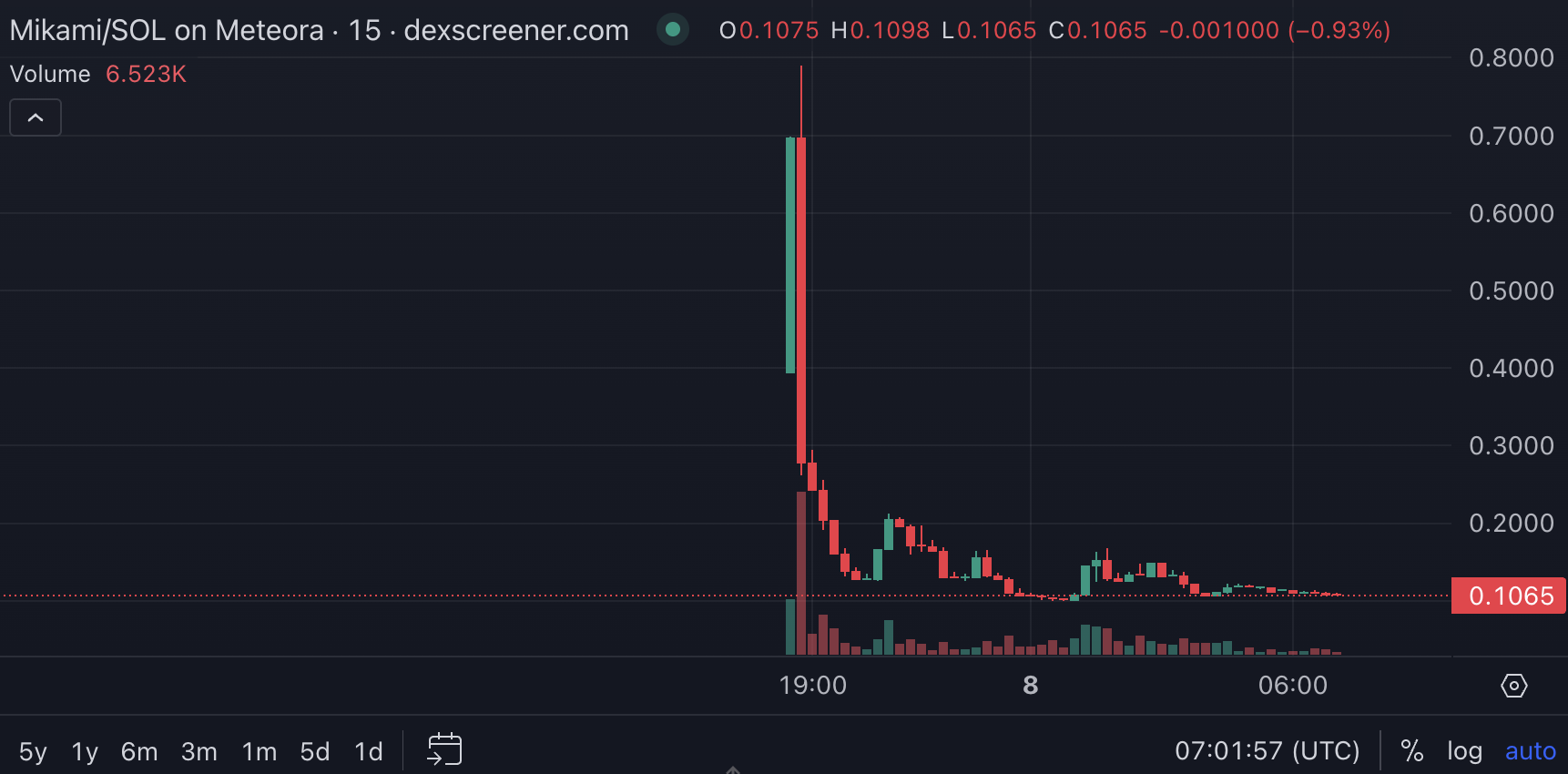 Tätä kirjoitettaessa tokenin hinta on jatkanut jyrkkää laskuaan, menettäen yli 80 % huipustaan, markkina-arvon ollessa noin 7 miljoonaa dollaria. Hintakaaviot Dexscreenerissä heijastavat tätä romahdusta, näyttäen MIKAMI:n putoamisen 0,828 dollarista 0,1 dollariin muutamassa tunnissa.