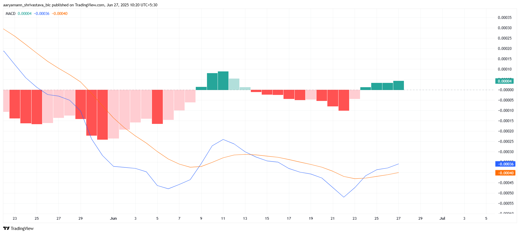 Laajemmassa markkinayhteydessä Zilliqan tekniset indikaattorit osoittavat mahdollisen käänteen merkkejä. Moving Average Convergence Divergence (MACD) havaitsee noususuuntaisen risteämisen, mikä voi viitata positiivisen trendin alkuun. Jos tämä suuntaus jatkuu, Zilliqa voi kokea kestävää nousuliikettä, toipuen aiemmista tappioistaan.